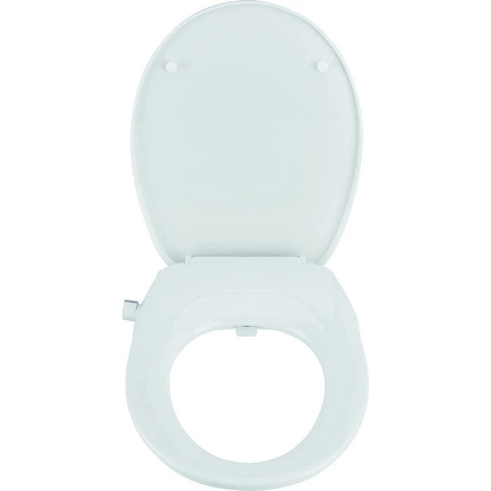 Abattant de toilette japonais déclipsable en polypropylène blanc. Installation simplifiée grâce à une platine réglable et une utilisation sans électricité.