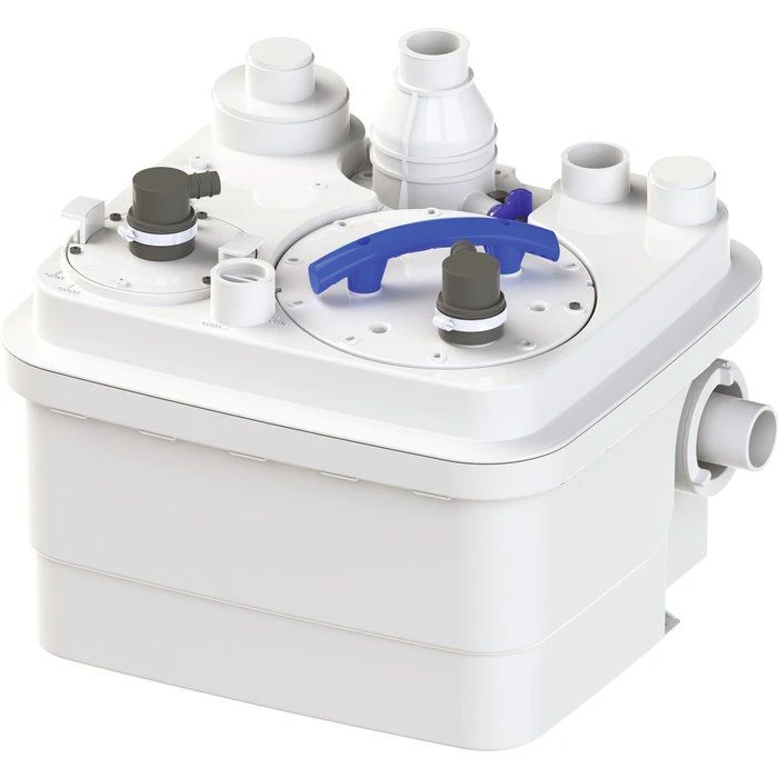 Avec ses 4 entrées (dont 2 basses) et son système de dilacération performant, la station de relevage à poser Sanicubic 1 WP peut évacuer toutes les eaux usées d’une maison par une évacuation de diamètre réduit (50 mm).